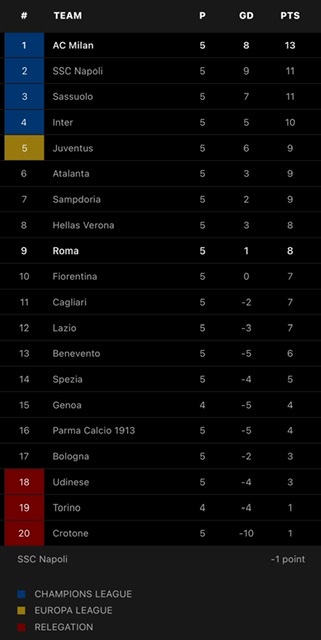 Meski tertahan, Milan tetap memuncaki klasemen sementara dengan koleksi 13 poin, sedangkan Roma berada di posisi kesembilan dengan delapan poin.