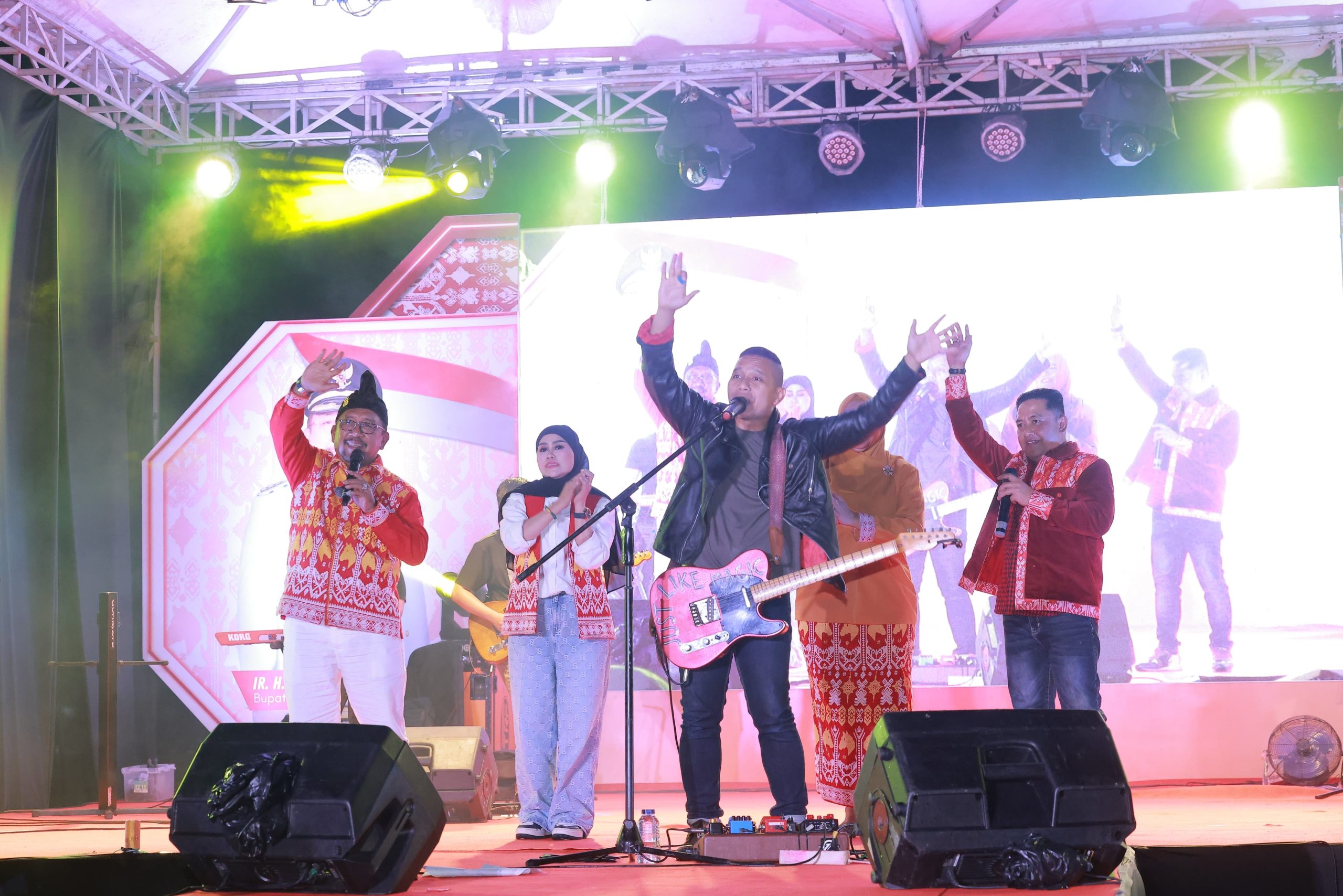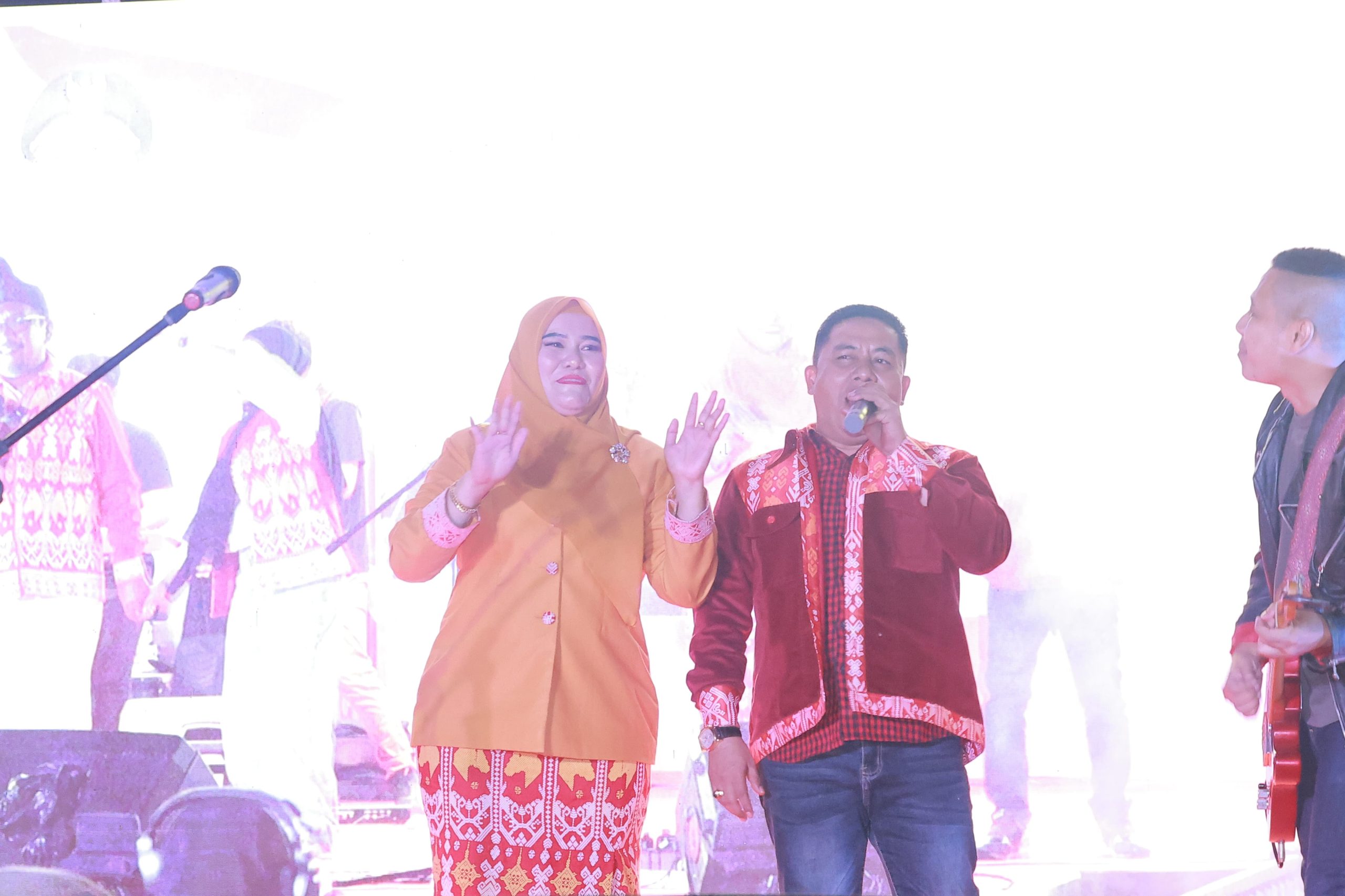 Bupati Bombana Ir H Burhanuddin M.Si dan istri yang juga Ketua Tim Penggerak PKK Hj Fatmawati Kasim Marewa S.Sos melambaikan tangan keoada hadirin di Pesta Rakyat HUT 80 RI di Alun-alun Kasipute Bombana, Ahad malam (17/8/2025).