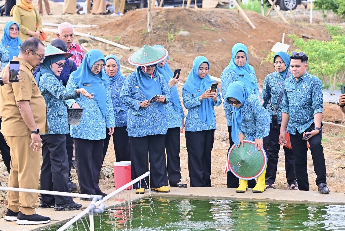 Bupati Bombana Ir H Burhanuddin M.Si (kiri), Ketua PKK Bombana Hj Fatmawati Kasim Marewa (dua dari kiri), Ketua PKK Sulawesi Temggara Arinta Andi Sumangerukka (ketiga daril kiri) di kolam ikan di Kebun PKK Bombana.