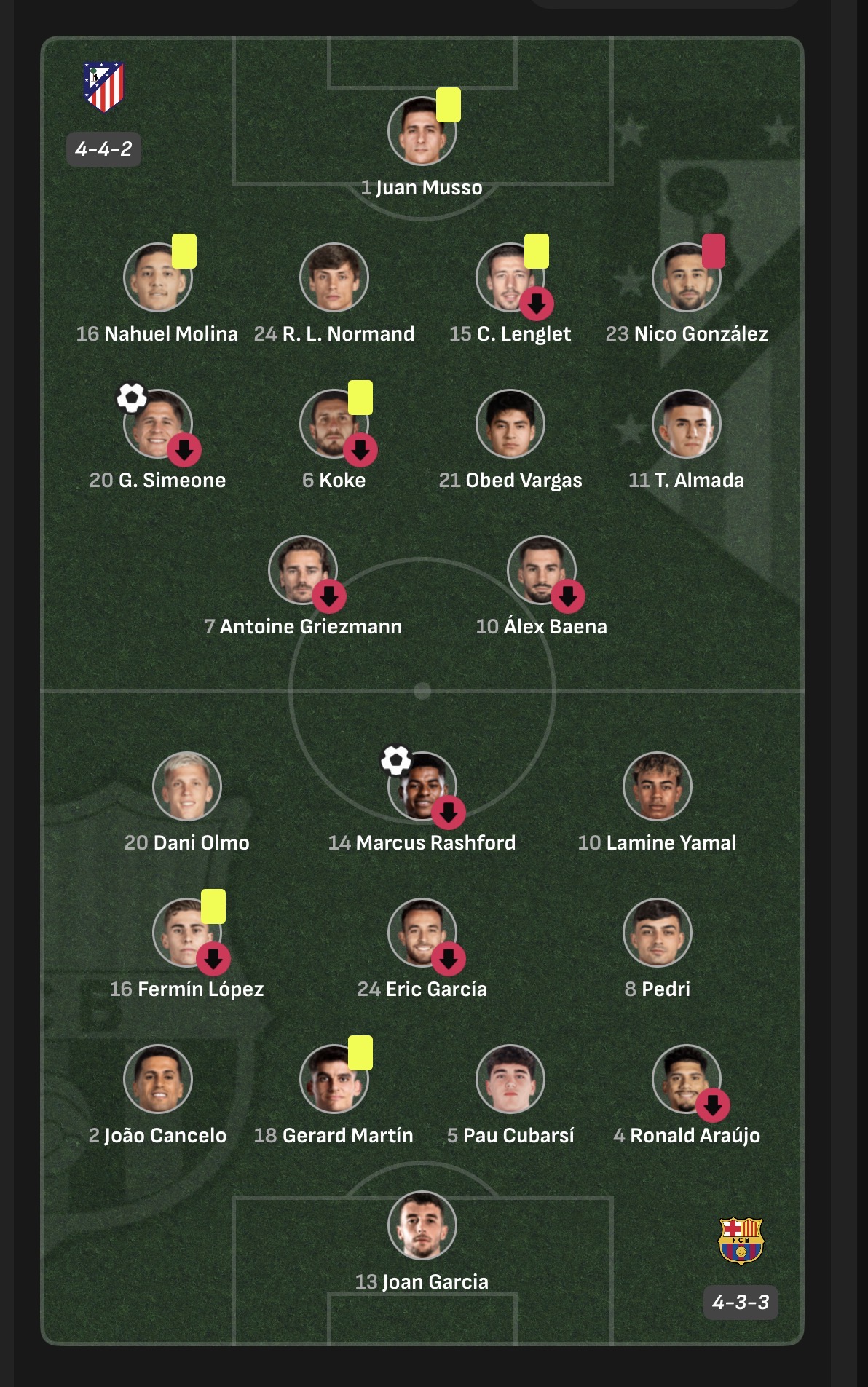 Atletico harus bermain dengan 10 orang setelah Nico Gonzalez mendapatkan kartu merah akibat melanggar Yamal di tepi kotak penalti.