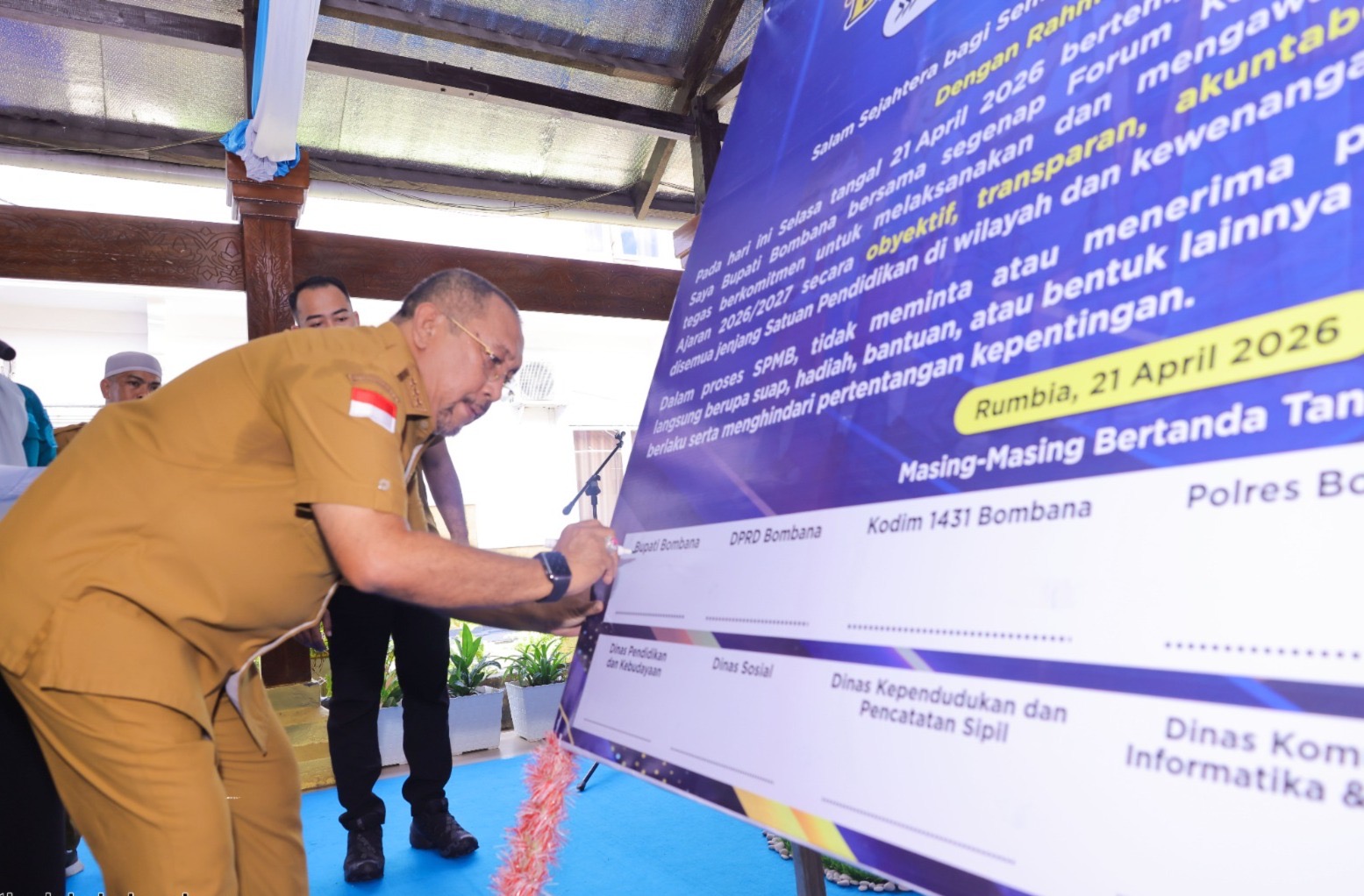 Bupati Burhanuddin penandatangan pertama Deklarasi Bersama SPMB di Kasipute Bombana, Selasa (21/4/2026).