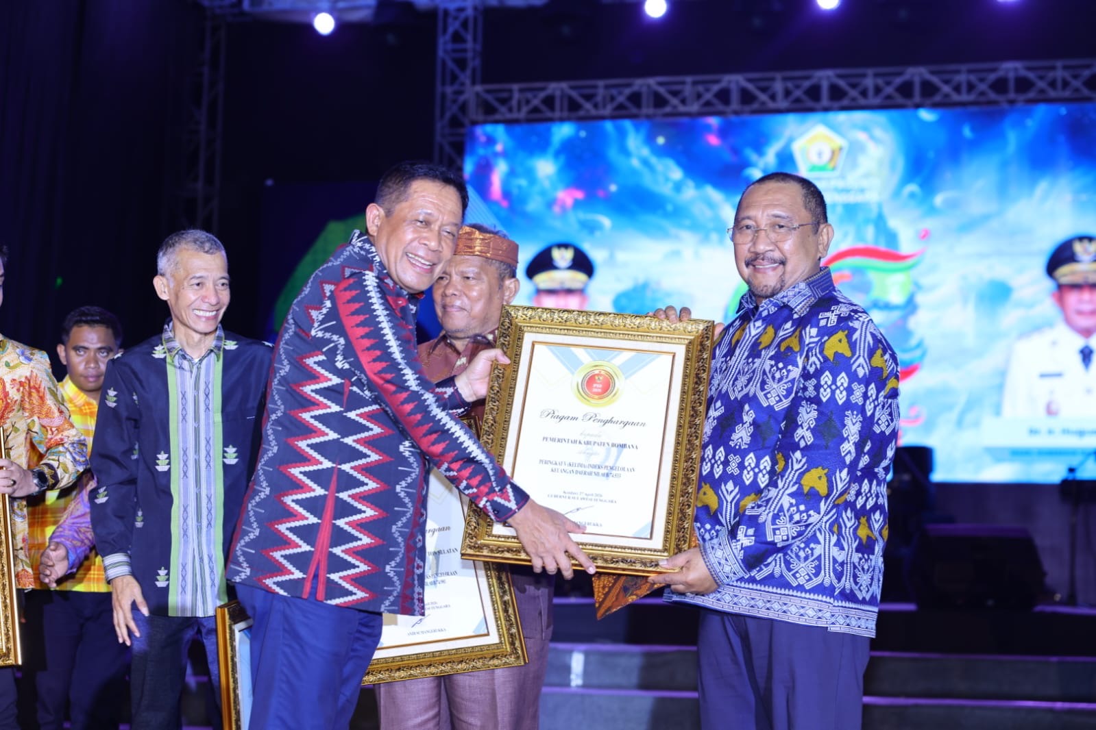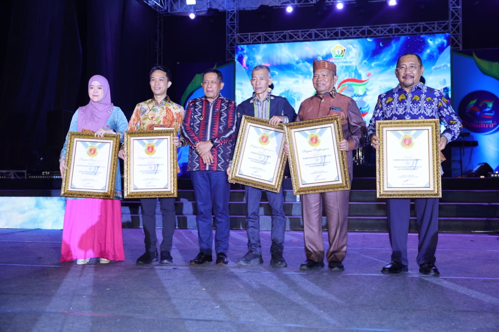 Bupati Bombana Ir H Burhanuddin M.Si menerima langsung piagam sertifikat peringkat dari Wakil Gubernur Sultra Dr Ir H Hugua pada acara puncak peringatan HUT 62 Sultra di Tugu Religius Kendari, Senin malam (27/4/2026).